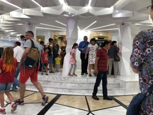 Once inside it was clear that this tower was going to be as fascinating inside as it was outside.  Two elevators were constantly filled with people going up to the top and with those waiting on the bottom.  The smooth lines and cool white light gave the downstairs section a modern feel.  There is an art gallery right off the main floor that is filled with works showing the history of Kazakhstan.